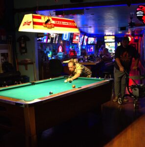 We’re not done yet, to keep the fun rolling off to the side is a 6-foot pool table at only 50 cents a game for the hustlers among us. It’s a fully equipped pool room with a variety of sticks and chalk with an ample seating arrangement. Right in the general vicinity is an electronic dart board with many game variations, plus…3 coin-op video games, retro style, including; Bowling, Golf and a Trophy Hunting shoot-um-up where you rummage around the wilderness looking for those deer and bears.